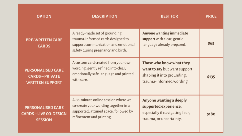 Your Care Cards will be prepared with care and intention, supporting you as you move through pregnancy, birth, and beyond with greater confidence and ease.